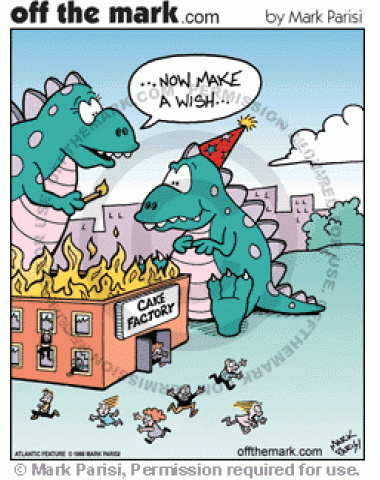 Godzilla Birthday Cake Godzilla's mom lights the top of a cake factory on fire for his birthday.