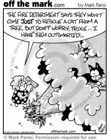 The fire department won't rescue a cat from a tree, so its owner sets the tree on fire.