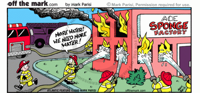 Firemen have trouble putting out a fire at the sponge factory because the sponges absorb the water.