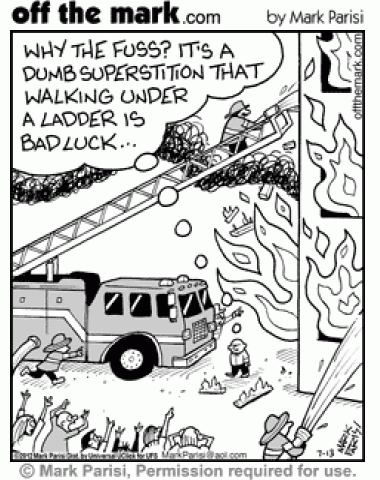 Oblivious man walking under ladder doesn't realize crowd is warning him about fire.