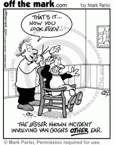Van Gogh Haircut Van Gogh's barber cuts off his other ear so he's symmetrical.