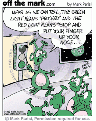 Aliens learn what traffic signal lights mean on Earth - green for proceed and red for stop and put your finger in your nose.