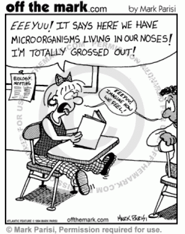Nose Microorganism A girl is disgusted to find out she has microorganisms living in her nose, but the microorganisms are even more grossed out.
