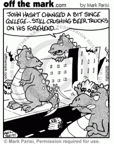 Godzilla's Drunk College Reunion A giant lizard monster crushes beer trucks on his forehead, just like he did in college.