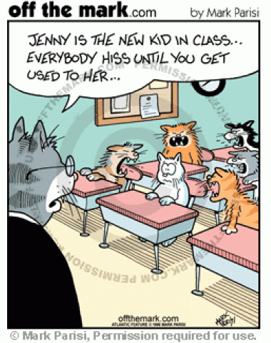 New Cat Student A cat teacher tells the students to hiss at the new kid in class until they get used to her.