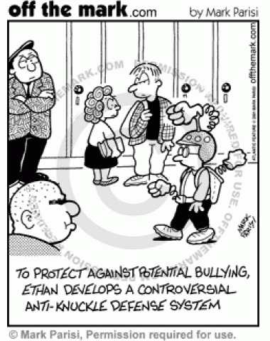 A boy has a backpack full of fists to keep bullies away.