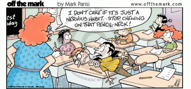 Pencil Neck Nervous Vampire A vampire chews on a pencil-neck because he's nervous.