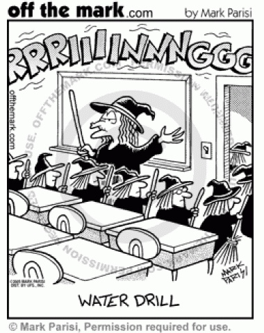 Witches Practice Drill at School A classroom of witches practice a water drill at school.