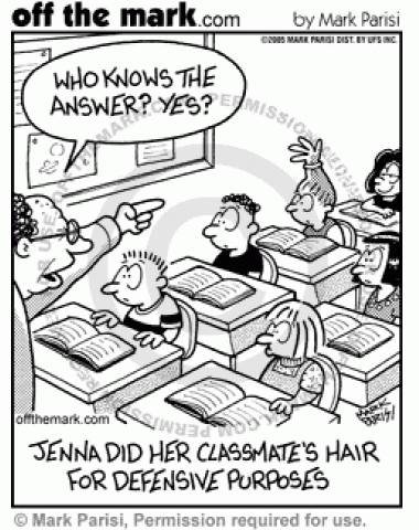 Hairstyle in School A girl does a friends hairstyle to look like a raised hand in school.
