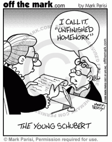 Student's Unfinished Homework Schubert as student hands unfinished homework and tries to make an excuse with the teacher.