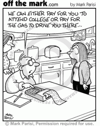 College vs. Gasoline Costs Budgeting parents tell daughter they can pay for her to go to college or the gas to drive her there.