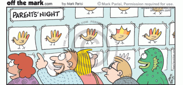 Creature's Hand Turkey Parents come to parents' night at a school and a monster looks at his kid's webbed hand turkey.