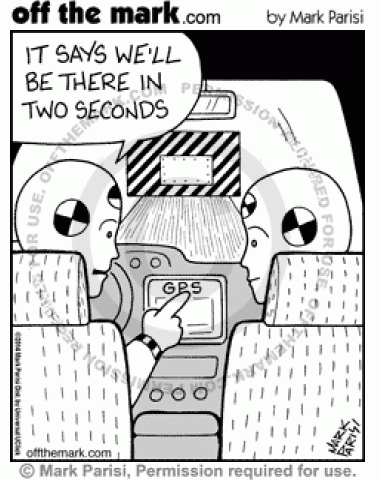Arrive At Wall Crash test dummies' GPS says they'll arrive in 2 seconds.