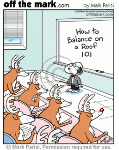 Snoopy's with dog house roof experience, teaches reindeer how to balance on roofs.