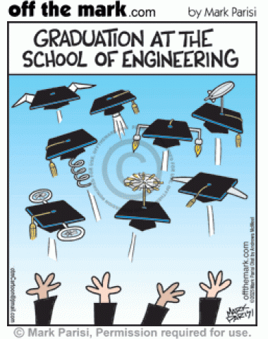 Graduation At The School Of Engineering Fly Mortarboard Inventions Graduating engineer college students toss flying machine mortar boards.