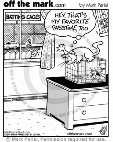 Cat Batting Cages A cat batting at rodent cage notices the batting cages outside and relates to the pastime.