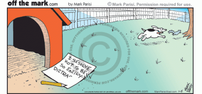 Dog's Unfinished Resolution A dog resolves to be less easily distracted, but he doesn't finish the note because he gets distracted by a squirrel.