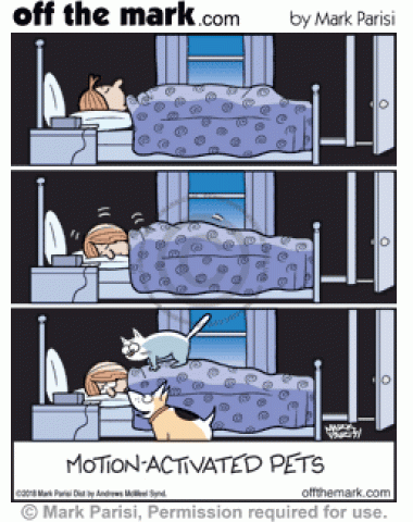 Motion Activated Pets at Night Sleeping woman’s pets suddenly appear at her bed as soon as she stirs.