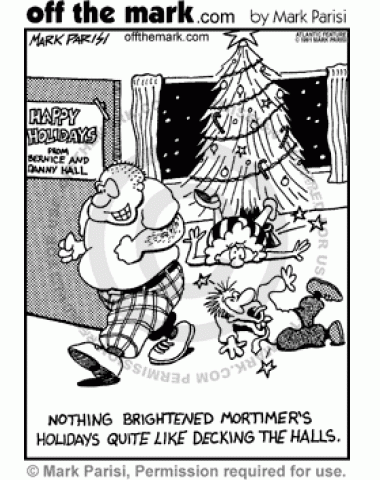 Deck the Halls Mr. and Mrs. Hall are lying on the floor beaten up by Mortimer because he loved decking the halls for the holidays.