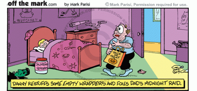 Halloween Raid Foiled A kid restuffs his empty Halloween candy wrappers with japapenos so his dad won't steal his candy.