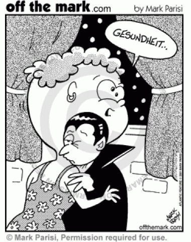 A vampire sneezes and his victim blows up like a balloon.
