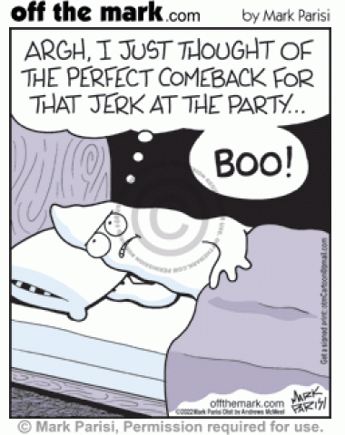 Annoyed ghost awake in bed thinks of scary boo comeback insult for jerk party guest.