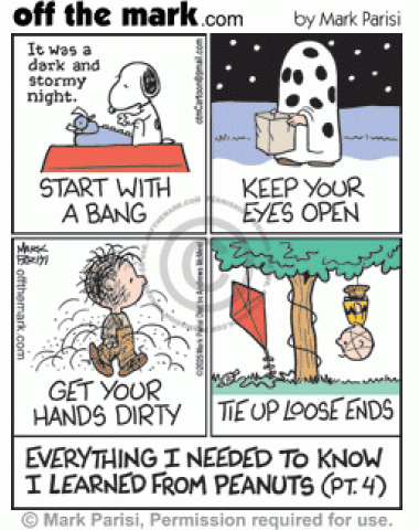 Everything I Needed To Know I Learned From Peanuts (pt. 4) Snoopy typing dark and stormy night story starts with a bang, Halloween costume Charlie Brown keeps his eyes open, messy Pigpen gets his hands dirty & tangled kite string Charlie Brown ties up loose ends.