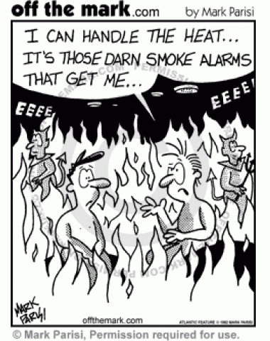 Smoke Detector Hell A man standing in the fires of Hell can handle the heat, but the noise of the smoke detectors going off drive him crazy.