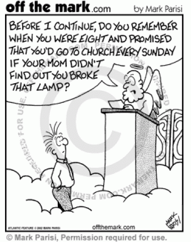 Broken Lamp Church Promise A man promises to go to church every Sunday if his mother didn't find out he broke a lamp when he was a boy.