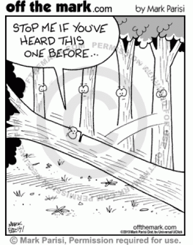 A tree falls in the woods and says "Stop me if you've heard this before."