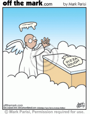 Sticky Pizza Dough Toss Covers Angel’s Halo Angel cooking pizzas in heaven covered halo with messy tossed dough.