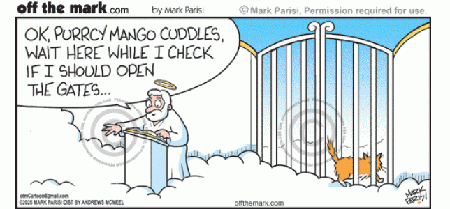 Sneaky Cat Squeezes Into Heaven Naughty kitty Purrcy Mango Cuddles squeezes through pearly gates before St. Peter judges life.
