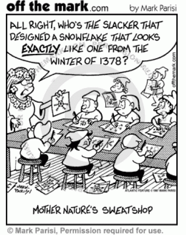 Mother Nature's Sweatshop Mother Nature complains that one of her elves made a snowflake identical to one from the past.
