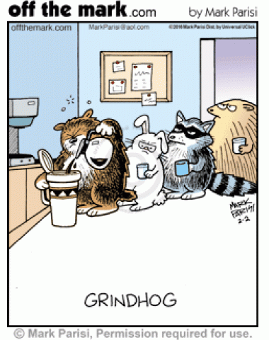 Grindhog Groundhog Groundhog hogs all the coffee in his extra-large cup.