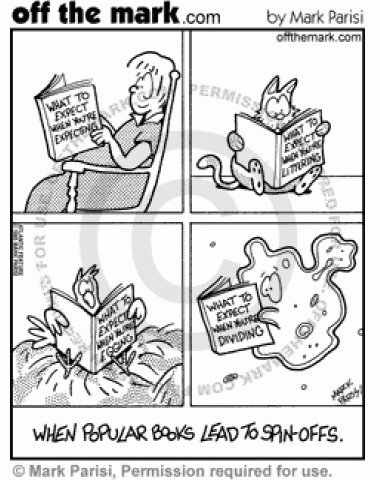 Book Spinoffs What to Expect when You're Expecting came out in different versions for humans, cats, birds, and amoebas.