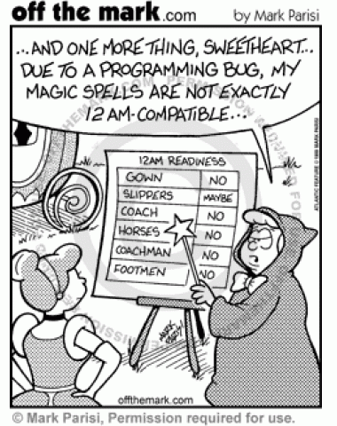 Cinderella's fairy godmother warns her about her spells' midnight compatibility.