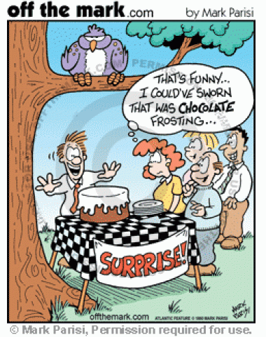 Chocolate frosted birthday cake become white when bird poops on cake.</p>