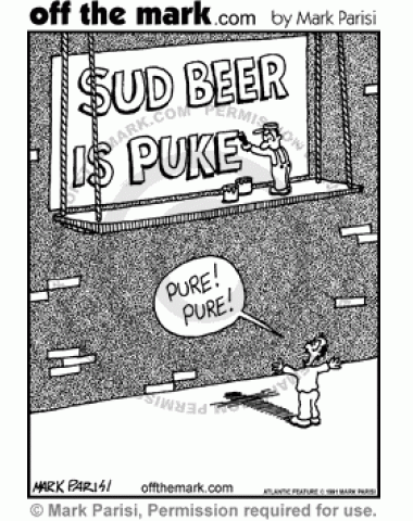 Man paints billboard that says, "Sud Beer is Puke," another man yells at him that it's supposed to say pure, not puke.