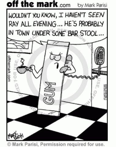 Chewing Gum All Nighter Stick of gum talking on phone tells friend she hasn't seen Ray all night, and he's probably stuck under some bar stool.