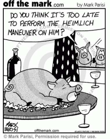 Pig Heimlich Maneuver Pigs see another pig on a table with an apple in his mouth.