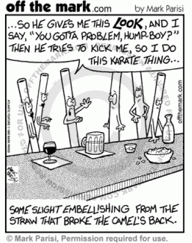 Straw Broke Camel's Back A straw at a bar tells an embellished version of the story of how it broke a camel's back.