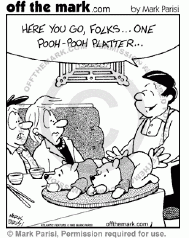 Pooh-Pooh Platter A couple at an Asian restaurant receives a platter with Winnie the Pooh on it instead of a poo-poo platter.