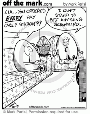Scrambled Eggs Cable An egg is mad at his wife for ordering every cable channel because she hates to see things scrambled.
