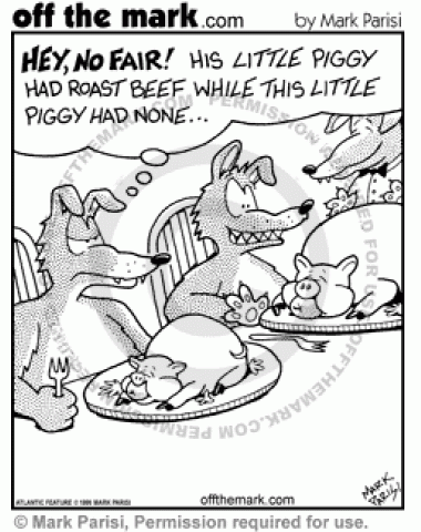 Wolf Roast Beef A wolf is jealous because he doesn't get a piggy who had roast beef.