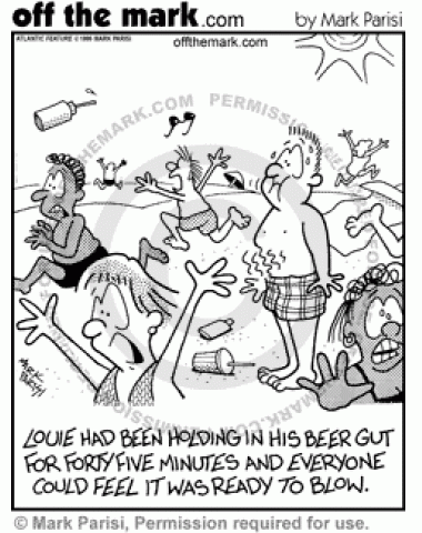 Beach Beer Gut Everyone runs away from a man who's been sucking in his belly for 45 minutes because it's about to explode.