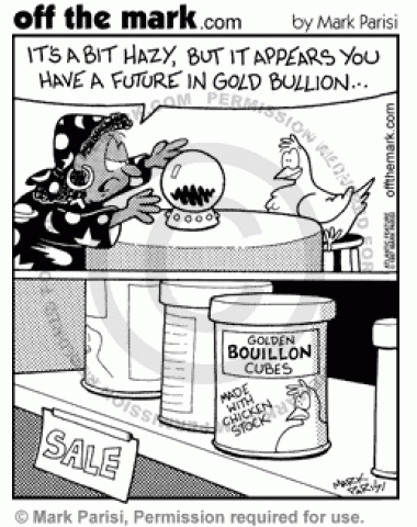 Chicken's Bouillon Future A chicken's fortune teller says she has a future in gold boullion -- soup boullion.