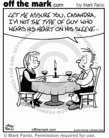 A man on a date says he doesn't wear his heart on his sleeve, but that's because he wears it on his pant leg.