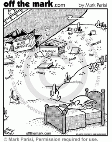 Fish Rice Krispies Noise A fish can't sleep because a boat transporting Rice Krispies sank near his bed.
