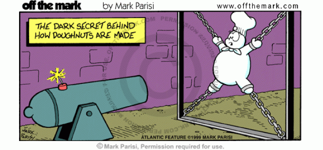 Donuts are made by shooting a cannonball through the Pillsbury Doughboy.