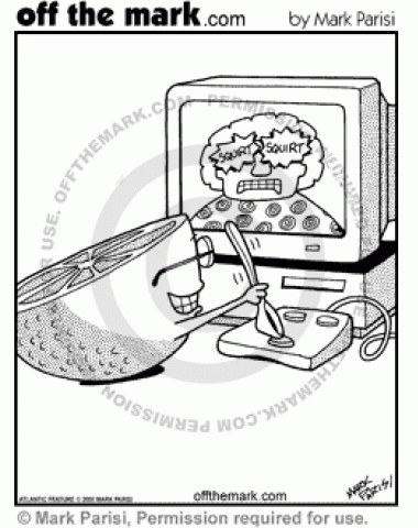 Grapefruit Video Game A grapefruit plays a video game where it can use a spoon to squelch out people's eyes.